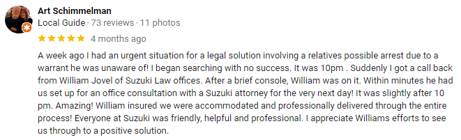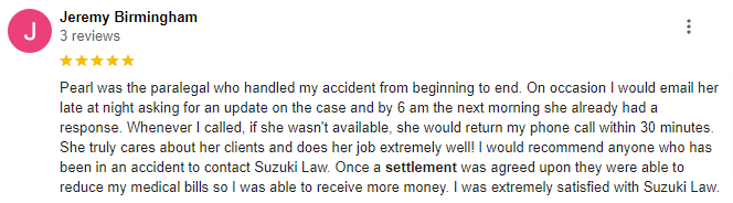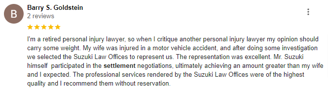 “Hopefully, no one needs a lawyer often but when you do you’ll want to contact Suzuki Law,” “His expertise and dedication to his clients are truly remarkable,” “Suzuki Law treated me with patience and respect while I was treating my injuries,” “When I would call they would always have an update with my case, and was happy to take my call,” “I highly recommended Mr. Suzuki and his team to assist if you’re ever involved in an accident,” “I could not be more grateful for how reassuring the whole team was and how on top of things they seemed to be at all times,” “gives it to you straight and doesn’t sugar coat anything,” “His positive attitude and honesty really helped me in a very difficult time,” “aided me throughout every step of my court case, making the process easy, & the results were a success,” “Suzuki Law Offices, L.L.C. provides top-notch service.”