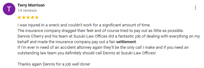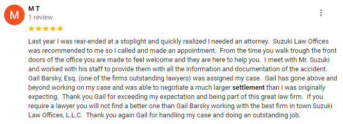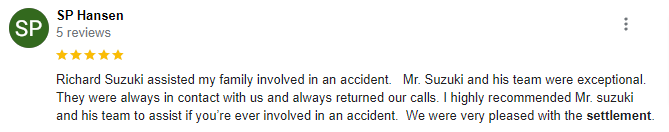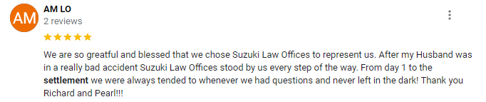 I couldn’t ask for more out of a law firm. I made an appointment the same day I called to inquire about the services. Richard was very helpful and honest about all of our options. My case was handled swiftly with the best possible outcome! I will recomend Suzuki law firm to everyone! Thank you Richard and team, we greatly appreciate you!